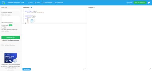 WEB上でSQLを実行できるお試しサイトの1つ。テーブルを作成、SQLを実行して結果が分かるので基本構文の勉強したいがインストールが面倒なときなどにおすすめ https://www.db-fiddle.com/ 1.左のテキストエリアにDDLとINSERT文を記述し、RUN CREATE TABLE …